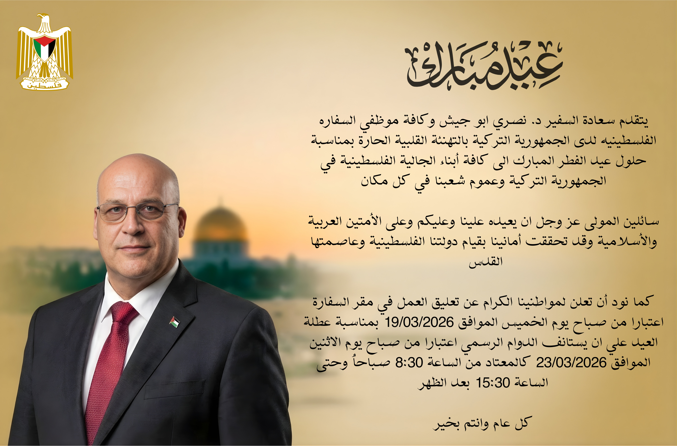 باسم سفارة دولة فلسطين لدى الجمهورية التركية وجميع العاملين فيها، يسعدني أن أرفع إليكم أطيب التحيات وأسمى عبارات التقدير، وأرحب بكم أجمل ترحيب عبر موقعنا الإلكتروني. نأمل أن يكون هذا الموقع جسر تواصل حيّ يفتح أمامكم آفاق التعرف على رسالة السفارة ودورها وأنشطتها المتنوعة، إلى جانب ما تقدمه من خدمات قنصلية مخصصة لأبنائنا الطلبة ولأبناء جاليتنا الفلسطينية الكريمة في الجمهورية التركية