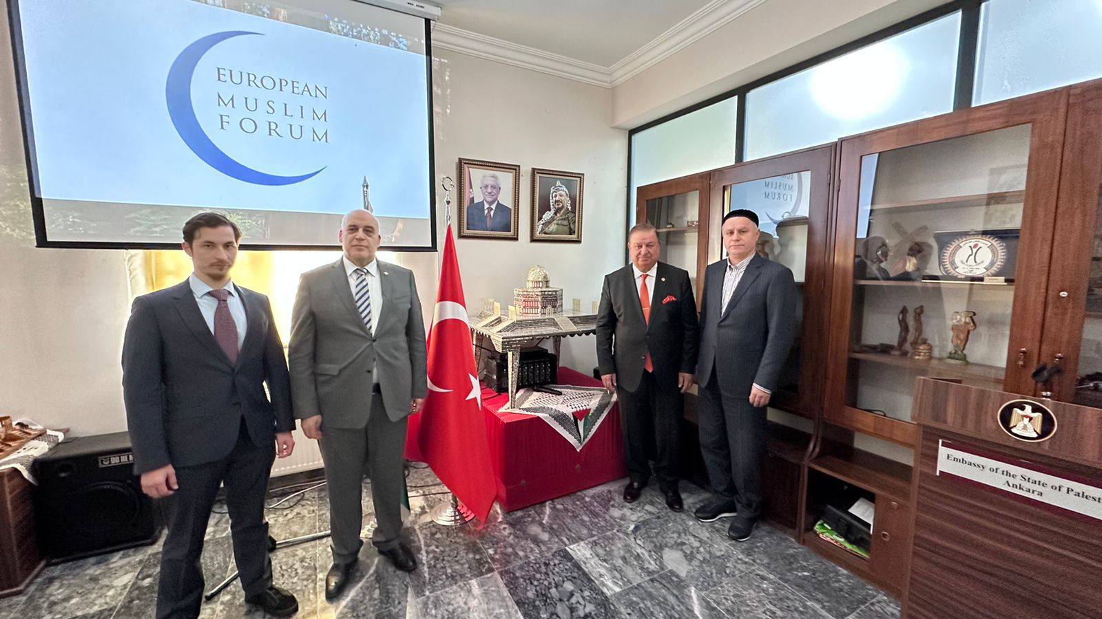 استقبل سعادة السفير د. نصري أبو جيش سفير دولة فلسطين لدى الجمهورية التركية وفدا من المنتدى الإسلامي الأوروبي قادمين من دول أوروبية متعدده بمشاركة سعادة النائب في مجلس الأمة التركي السيد دوغان بيكين وذلك في مقر السفارة بالعاصمة أنقرة